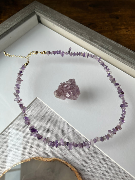 Amethyst Natural Stone Chip Choker Necklace with Gold Accents