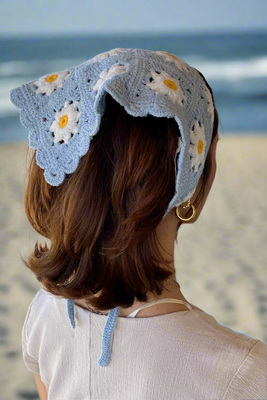 Vintage Style Dusty Blue Daisy Crochet Hair Bandana