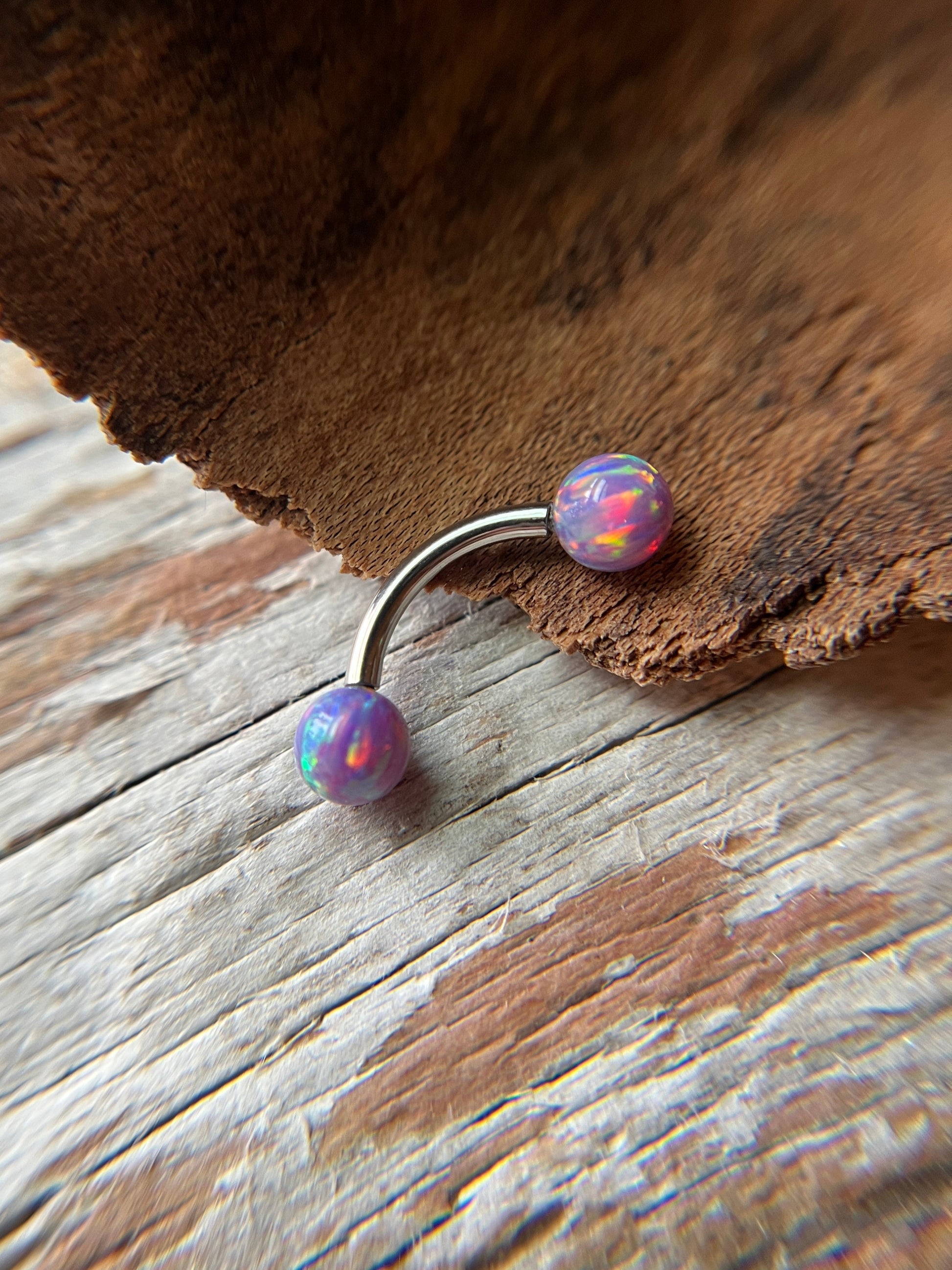 Materials: Your choice between (hypoallergenic solid 316L surgical steel) or (100% allergen-free, Implant-grade titanium {grade 6AL-4V-ELI ASTM F-136}) internally threaded curved barbell, and two 5mm synthetic fire opal stone balls.