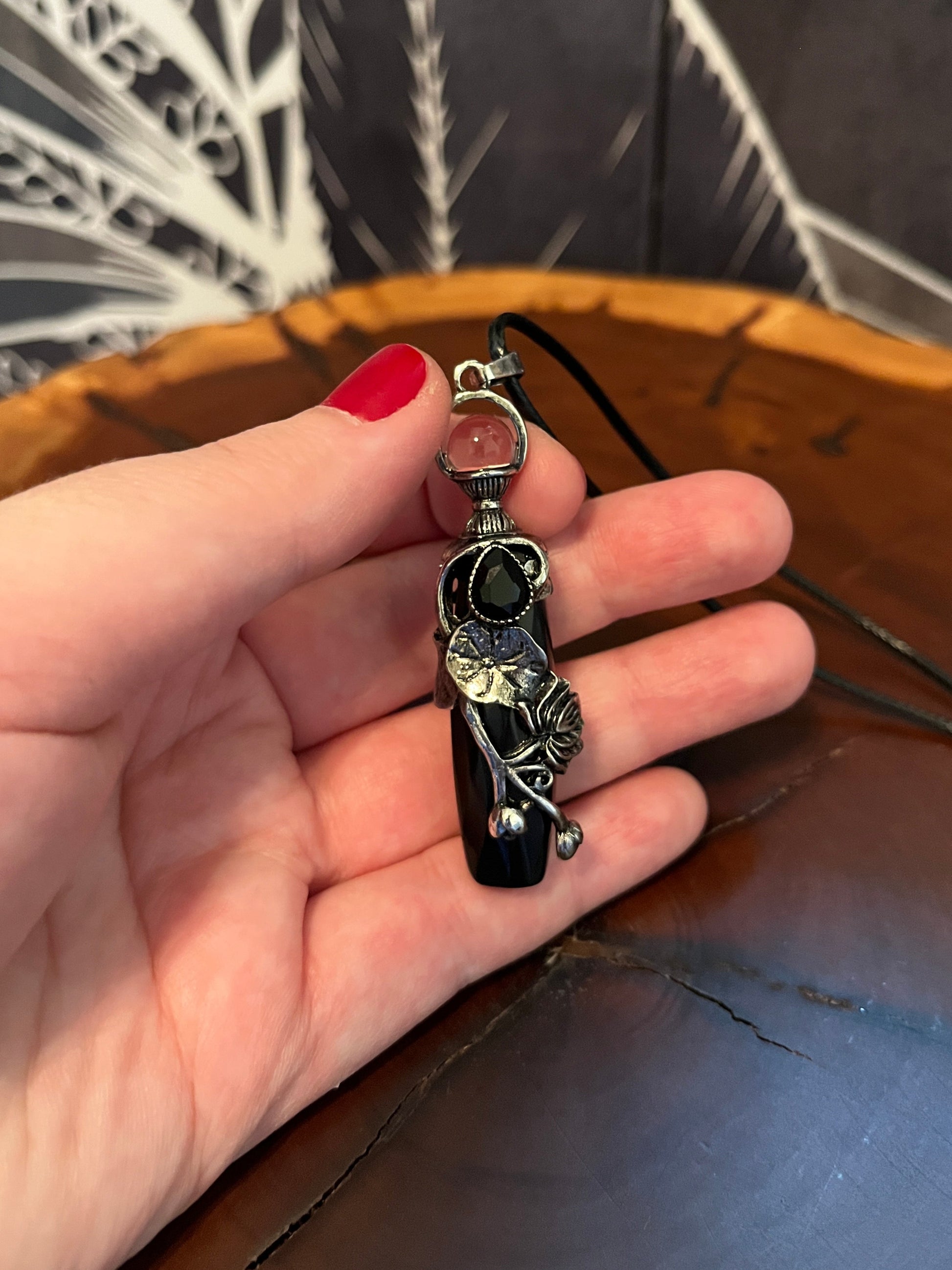 Materials: Genuine, natural stone pendant and black obsidian teardrop gem, crystal glass ball top, and an alloy metal setting with a silver finish.