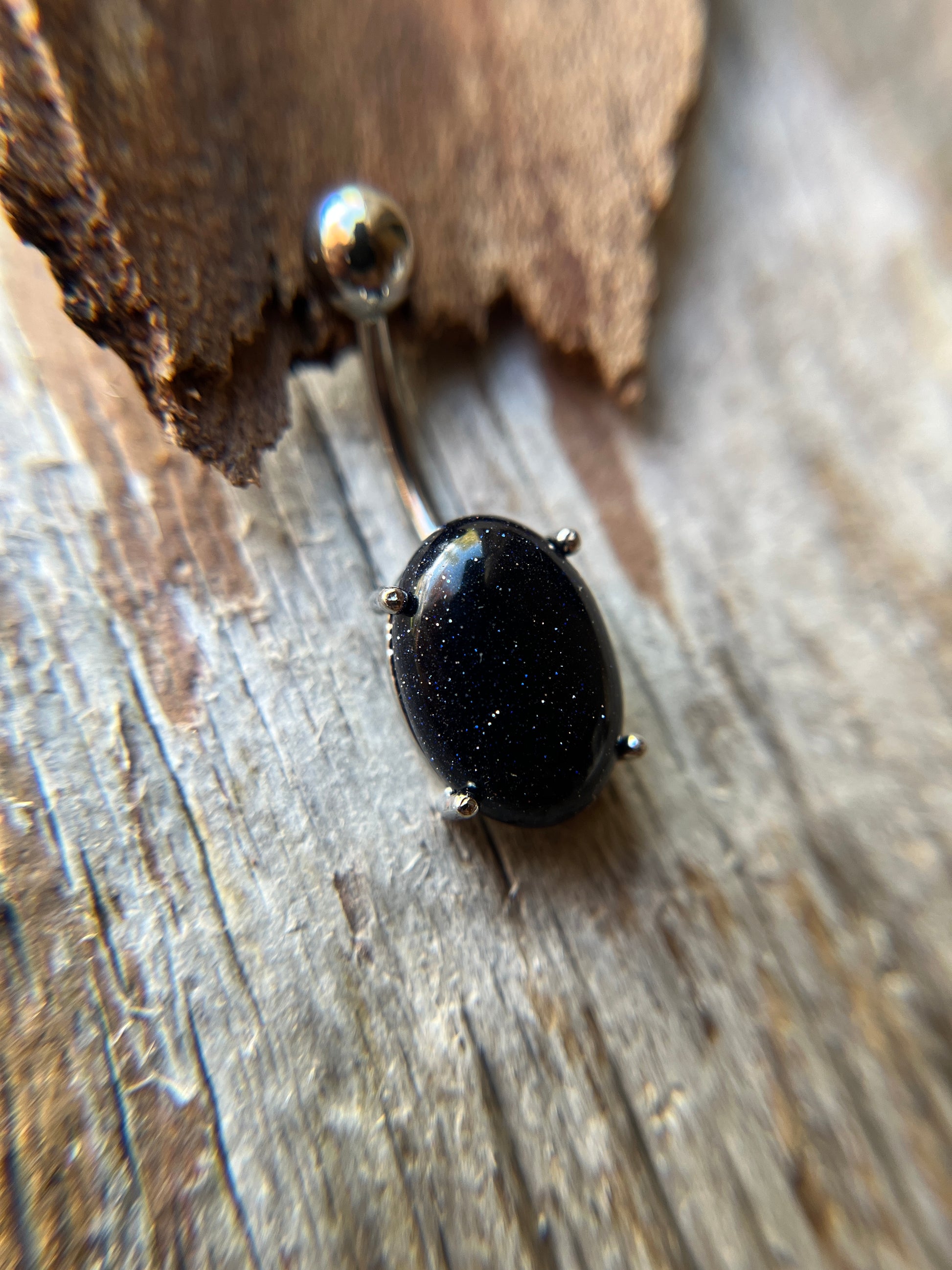 Galaxy Stone Blue Goldstone Pronged Oval Belly Ring 316L Surgical Steel
