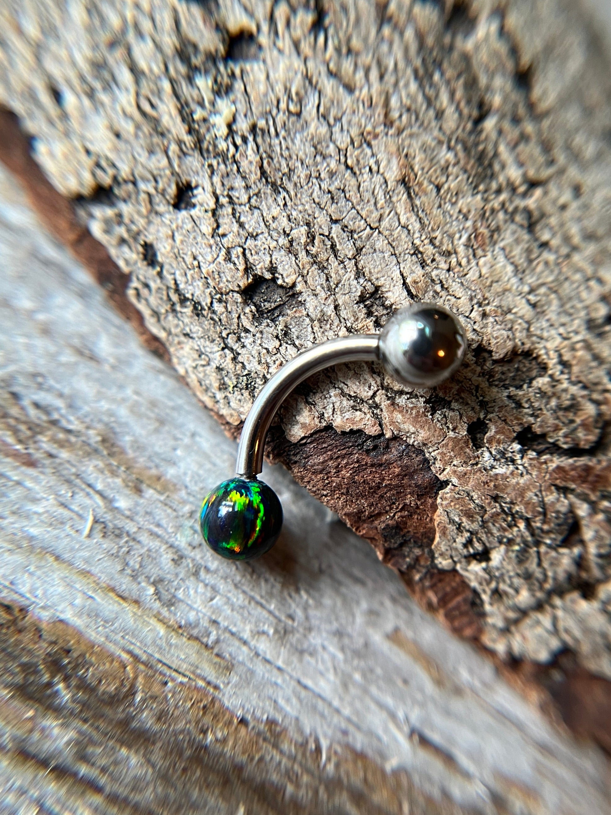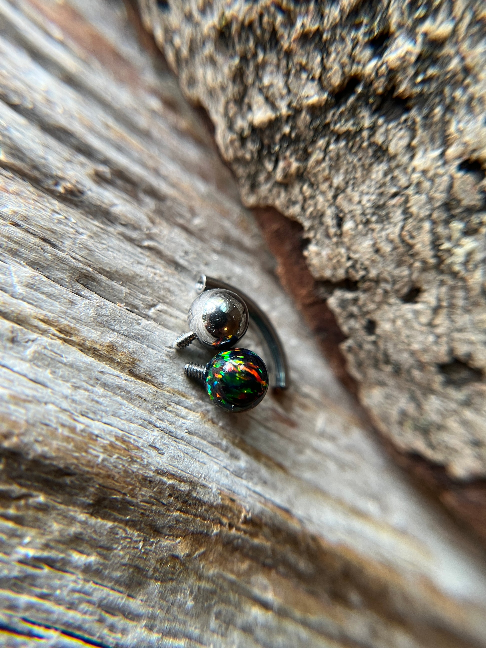 Materials: Your choice between (hypoallergenic solid 316L surgical steel) or (100% allergen-free, Implant-grade titanium {grade 6AL-4V-ELI ASTM F-136}) internally threaded curved barbell, one 5mm metal ball, and one 5mm synthetic fire opal stone ball.