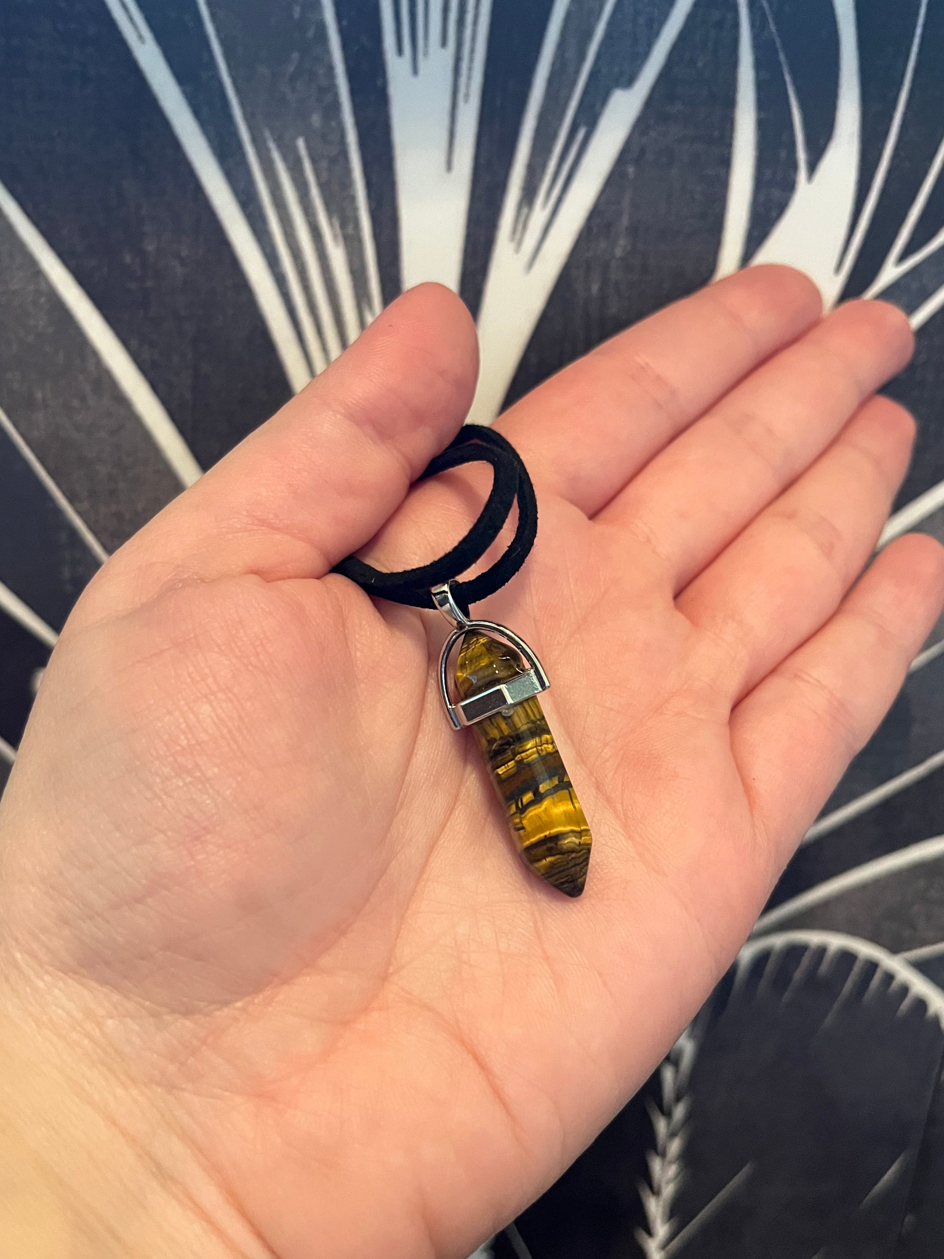 Materials: A genuine, natural stone pendant, synthetic (faux) suede leather neck cord, and an alloy metal bail, extension chain and lobster clasp with a silver finish.
