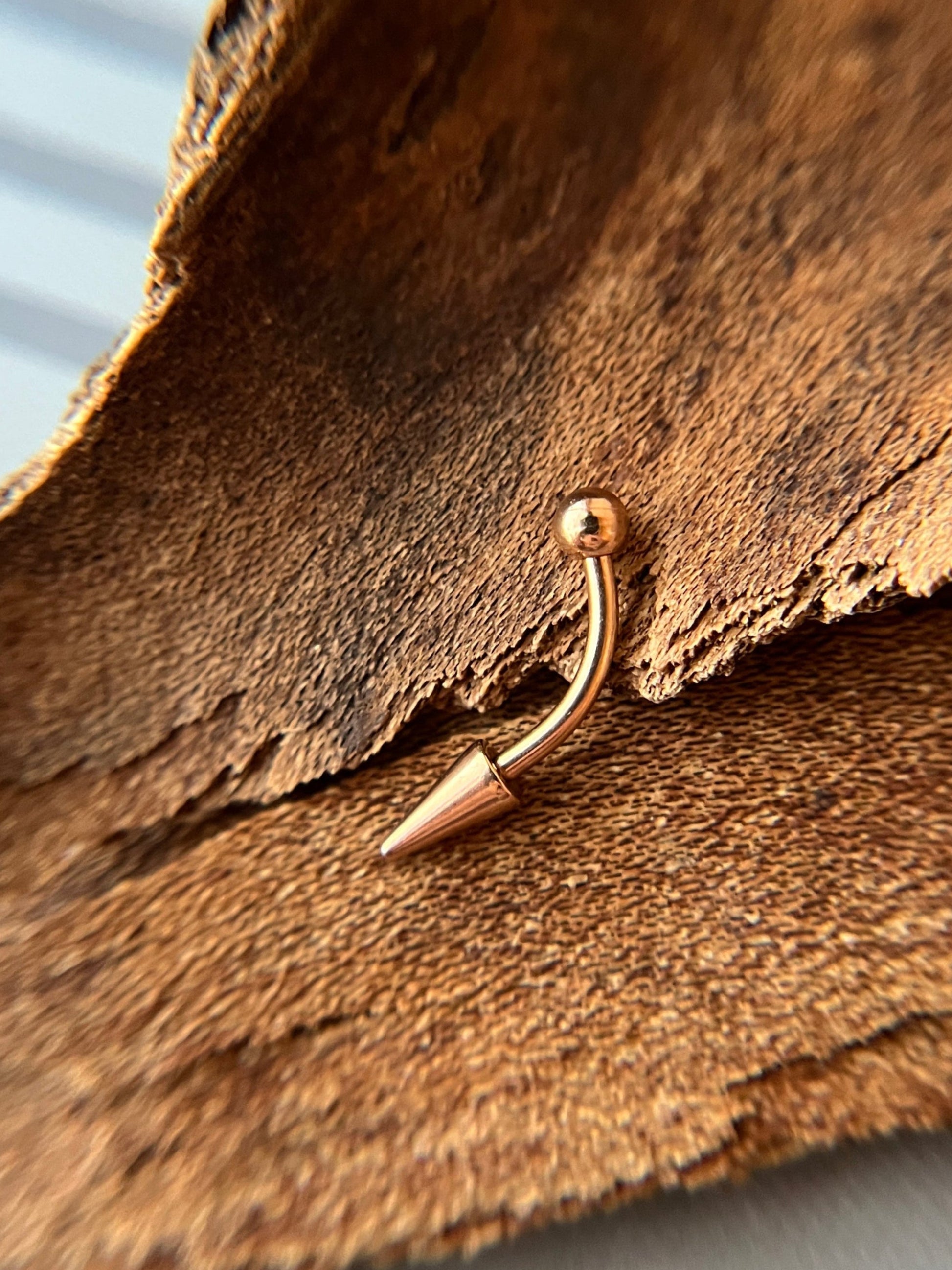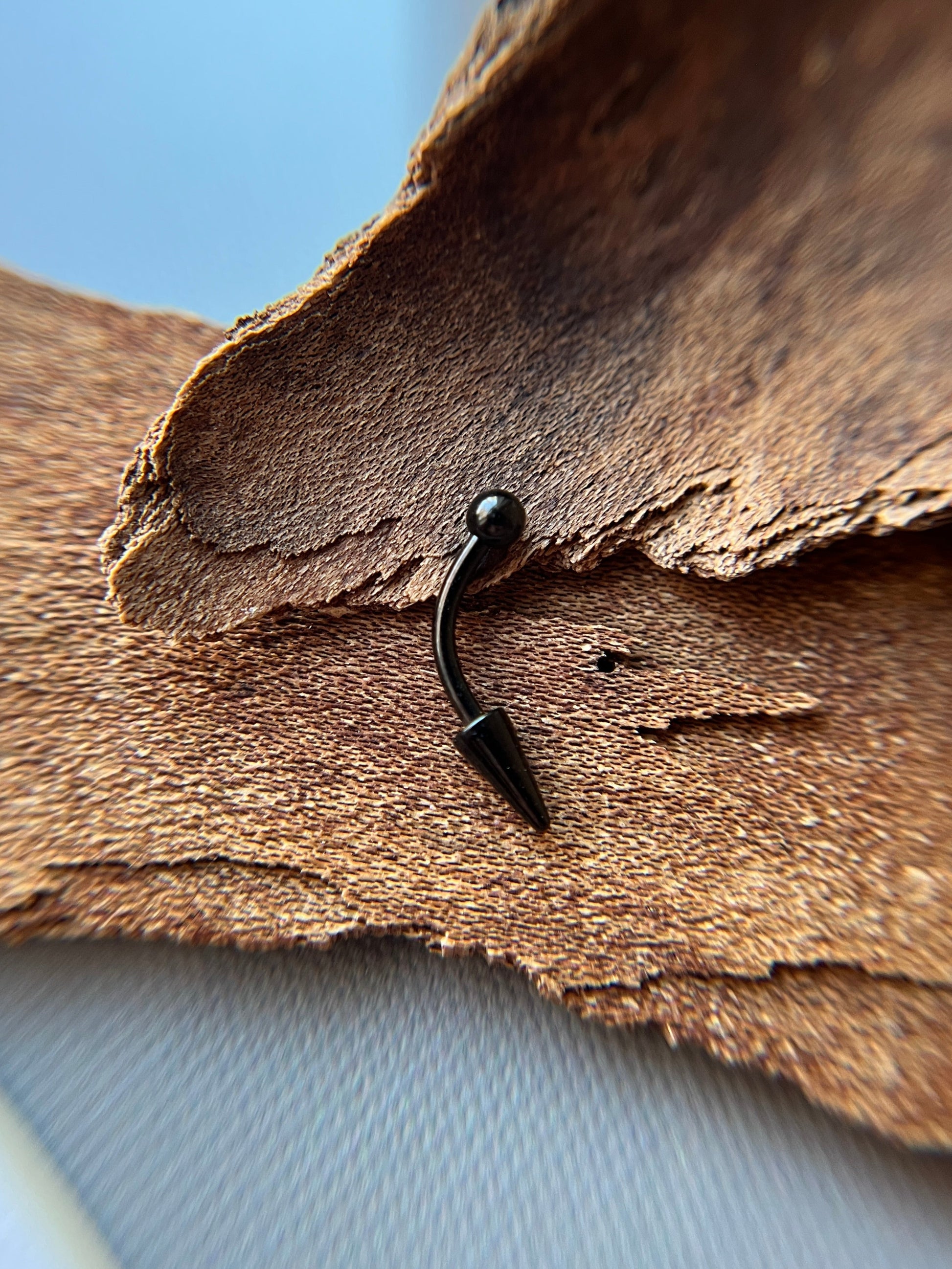 Materials: 316L surgical steel externally threaded curved bar, 6mm spike, and 3mm or/ 4mm ball ending with a titanium alloy ion plated finish.