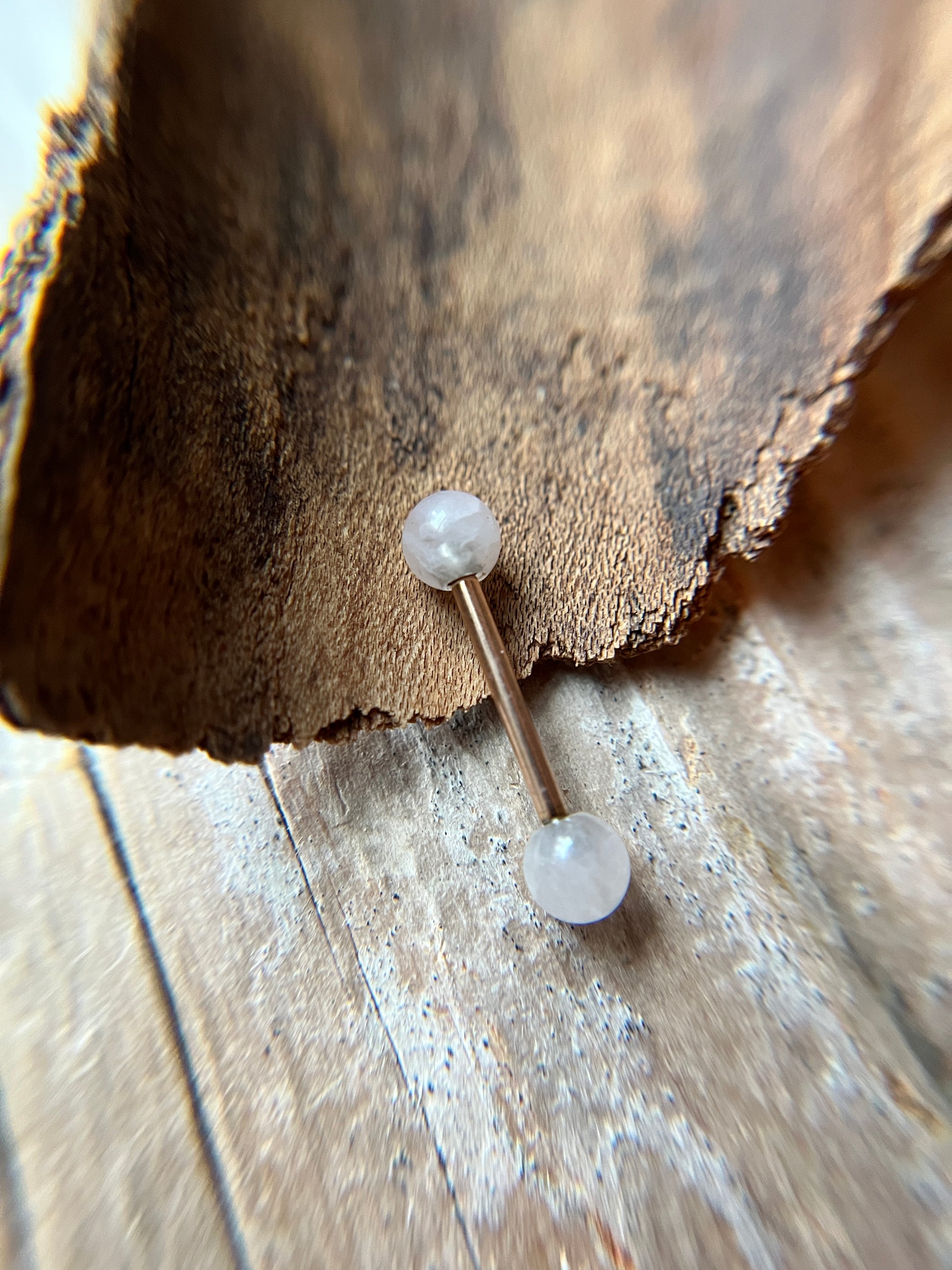 Always be gentle with your barbell when you are twisting on the natural stone balls, so that you do not accidentally strip the threading by over-tightening them. If you continue twisting the stone balls past the point where they reach a soft, natural stopping place at the end of their threading, you will most likely dislodge them and damage your jewelry.Β