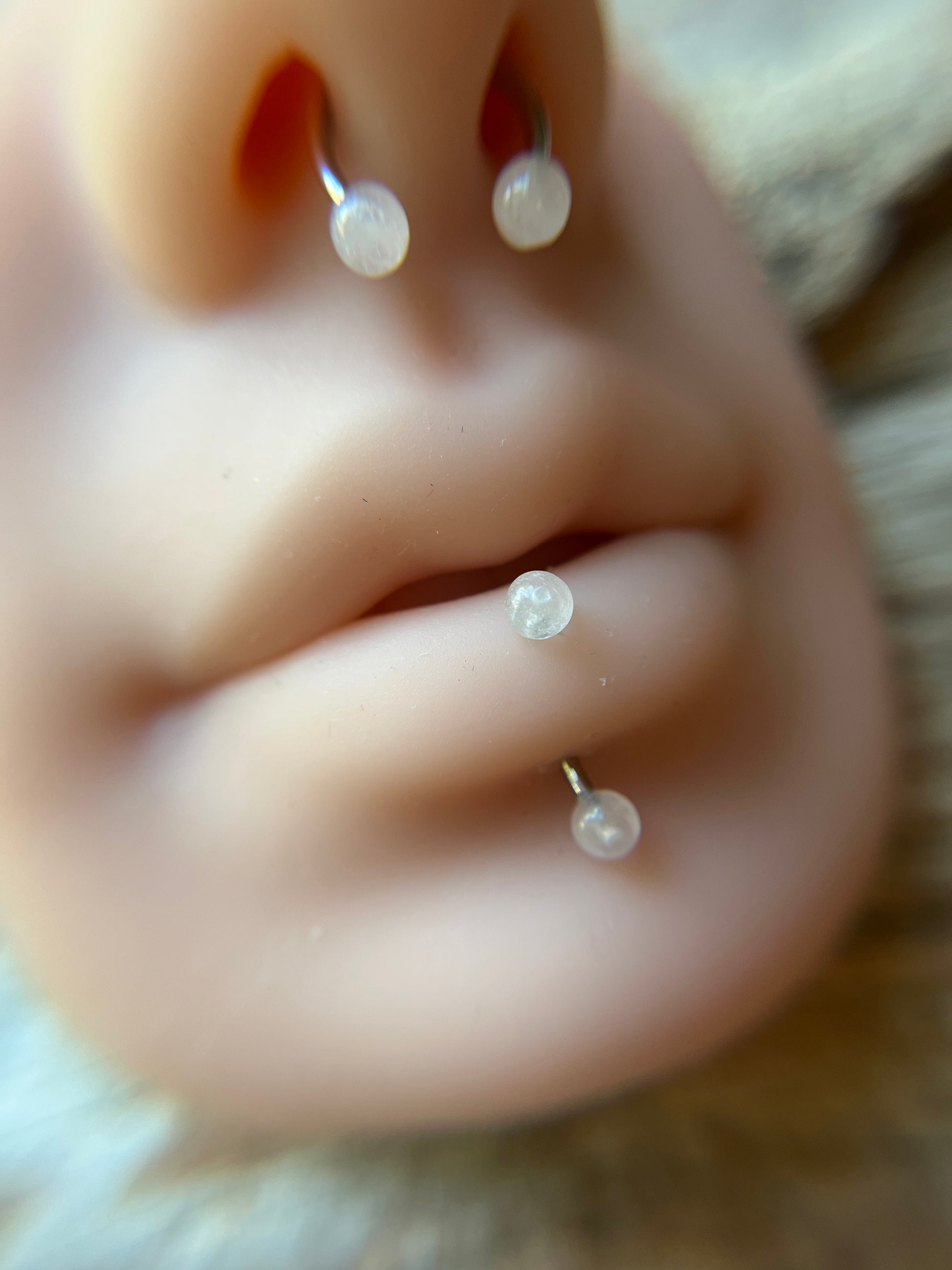 Materials: Your choice between (hypoallergenic) 316L surgical steel or (100% allergen-free) Implant-grade titanium {grade 6AL-4V-ELI ASTM F-136} internally threaded curved barbell, and two 4mm genuine natural stone balls.