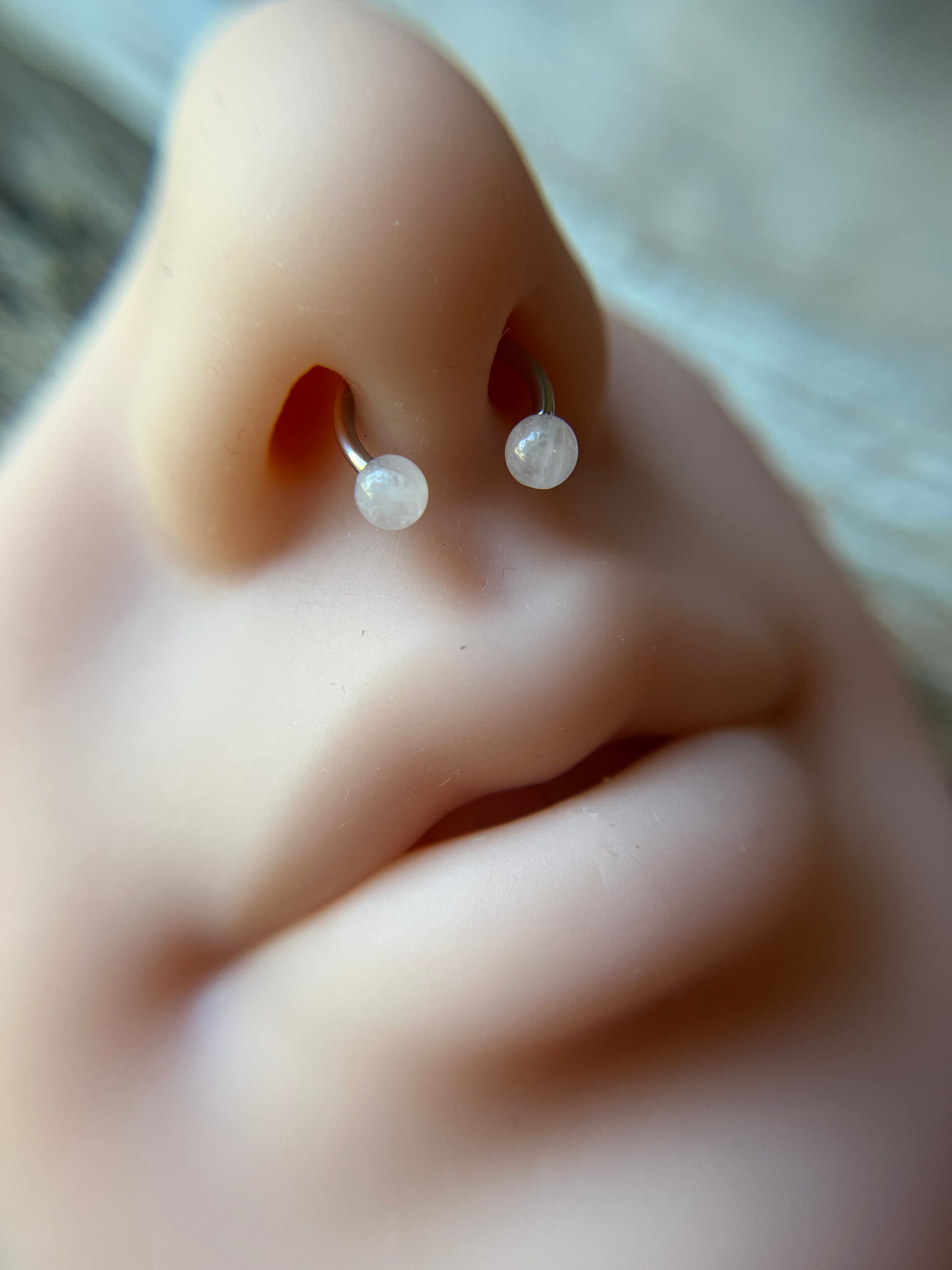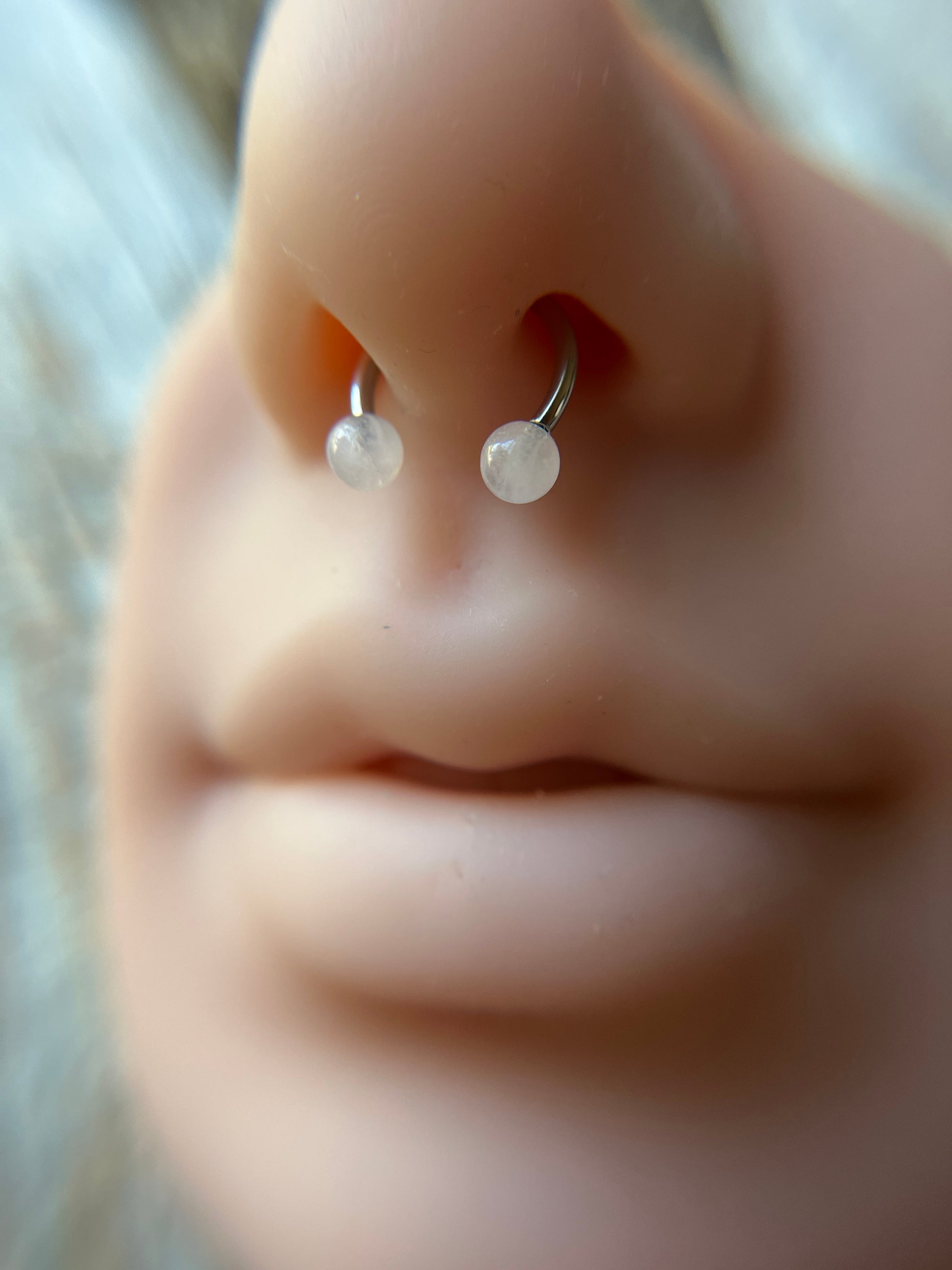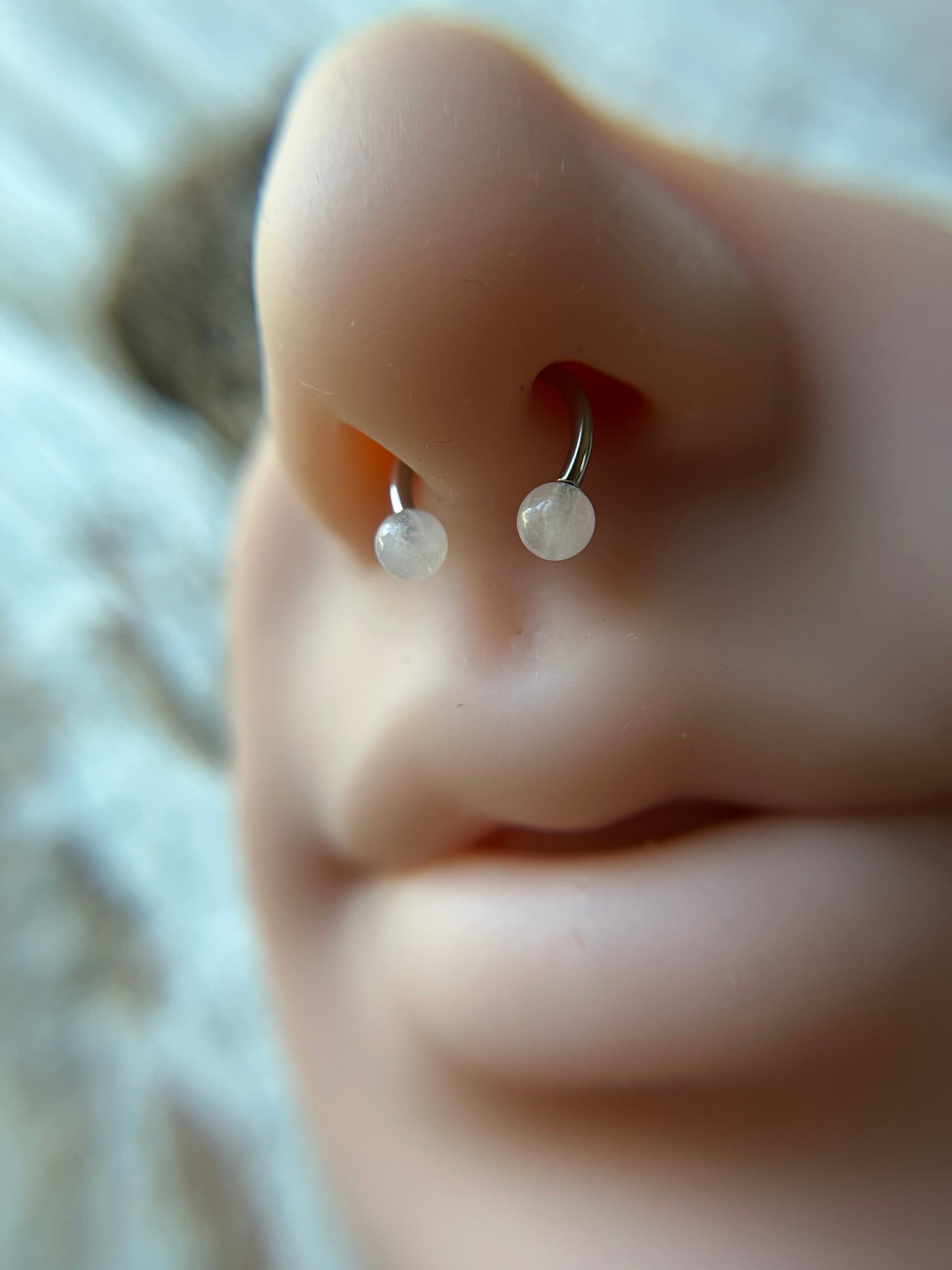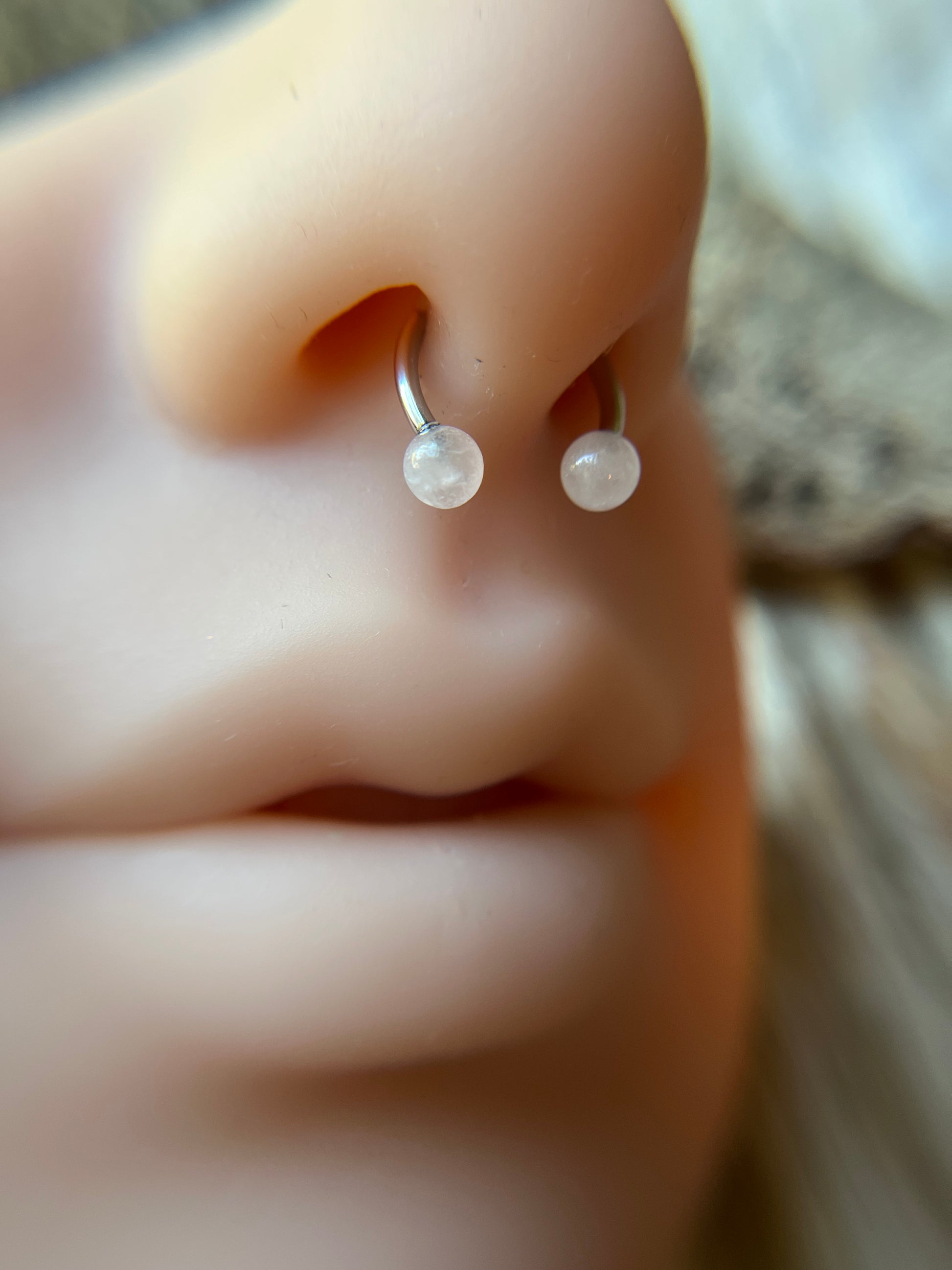 Materials: Hypoallergenic 100% 316L surgical steel internally threaded horseshoe ring and two 4mm natural stone balls. This piece is water-resistant, and a great choice for everyday wear!
