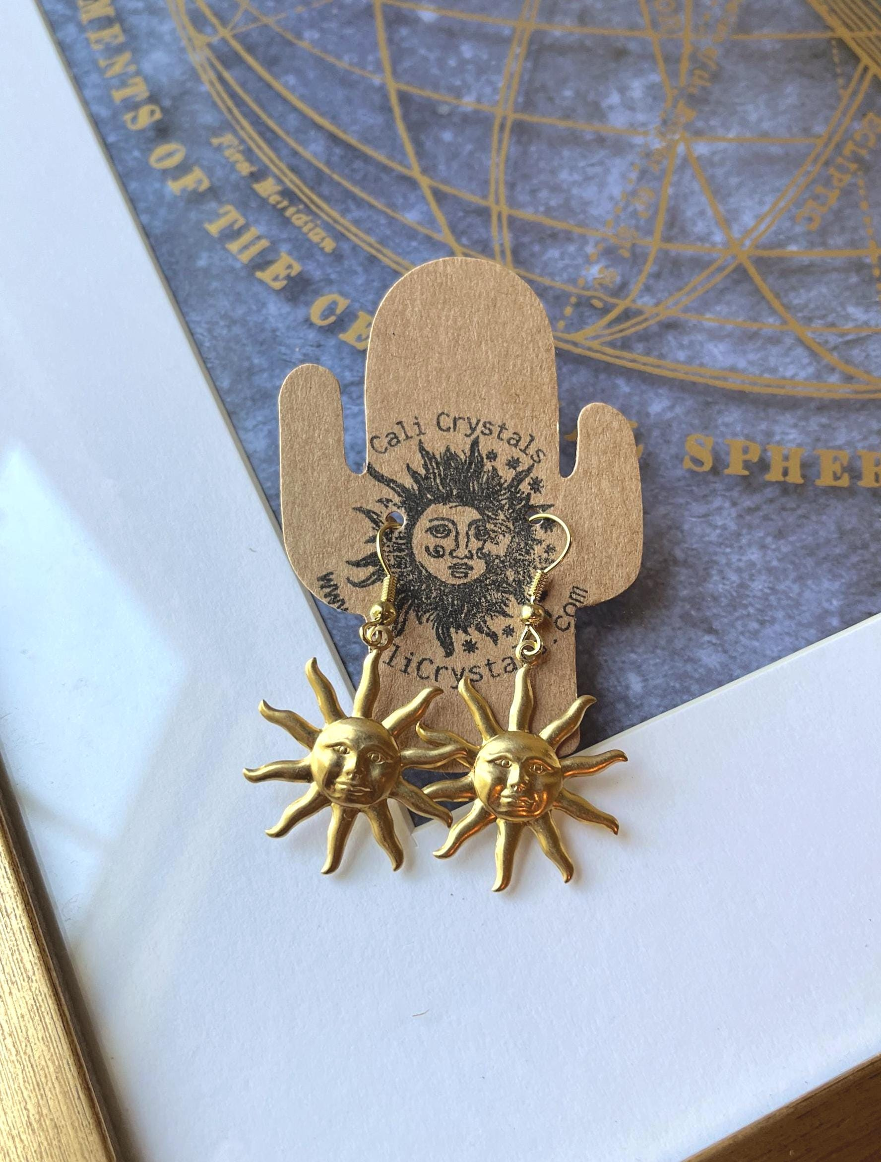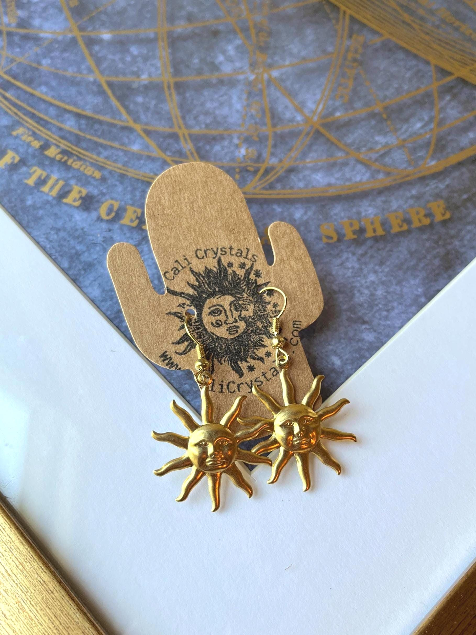 Measurements: The full drop length of these earrings is 1-3/4" (46mm). The sun charms measure 1-3/16" (30mm) by 1" (26mm).