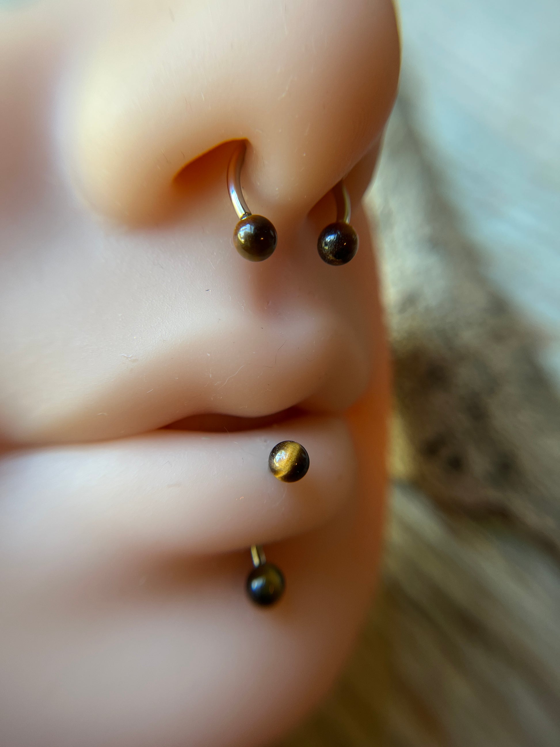 Materials: Hypoallergenic 100% 316L surgical steel internally threaded horseshoe ring and two 4mm natural stone balls. This piece is water-resistant, and a great choice for everyday wear!